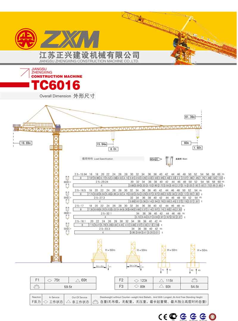 2、最大工作幅度60米,最大起重量8噸,末端最大起重量1.6噸,額定起重力矩1250KN.M;