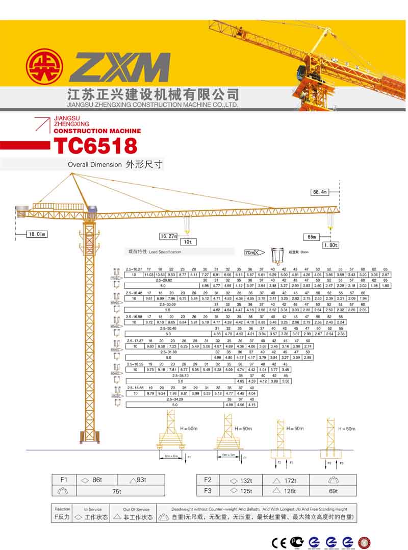 2、最大工作幅度65米,最大起重量10噸,末端最大起重量1.8噸,額定起重力矩1600KN.M;