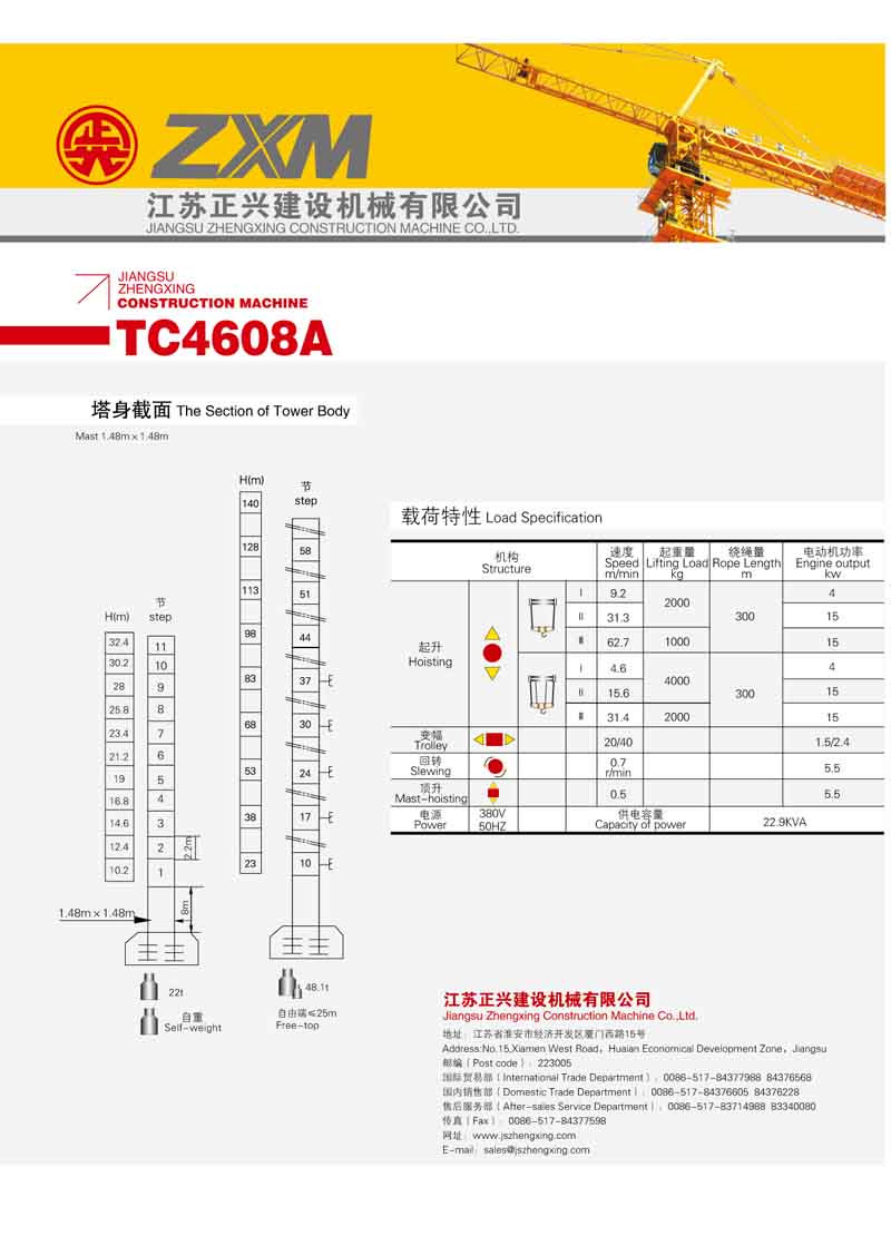2、最大工作幅度46米,最大起重量4噸,額定起重力矩400KN.M;