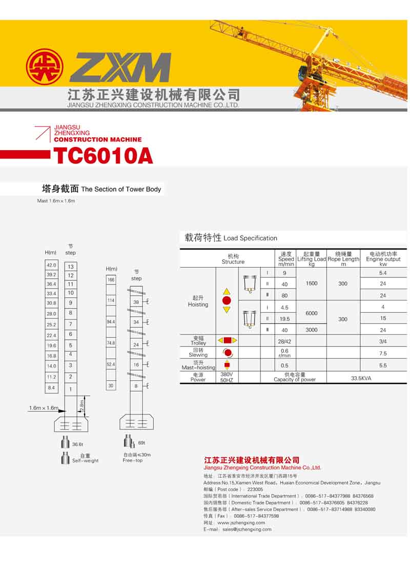 2、最大工作幅度60米,最大起重量6噸,額定起重力矩800KN.M;